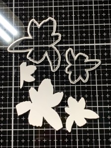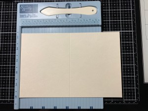 Taking the largest rectangle die from the Master Layouts 1 Die Set I cut out of Blue Denim Cardstock, running them through my Big Shot. Using Liquid Glue, I adhered the panels together. Next, I placed a 5 1/2″ x 8 1/2″ piece of Barely There Cardstock into my Scor Buddy and scored it at 4 1/4″, creating a side folding card base. I then added Foam Tape to the back of the panel and mounted it onto the card base.