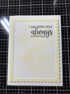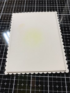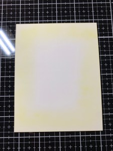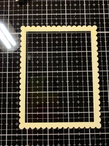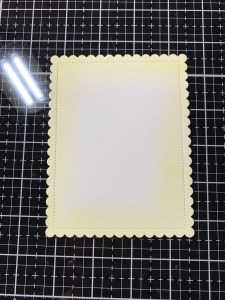 To start, I cut a 4 1/4″ x 5 1/2″ out of White Cardstock using my Guillotine Paper Trimmer. I then used my Blending Brush to softly blend Lemon Drop Ink around the four sides. Next, I took the scalloped rectangle die from the Master Layouts 4 Die Set and cut out of the blended panel, running them through my Big Shot Die Cut Machine. To create a frame from this panel I took the stitched rectangle die from the Master Layouts 5 Die Set and centered it between the stitching of the blended panel then ran them through my Big Shot.