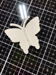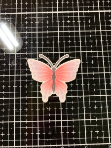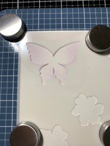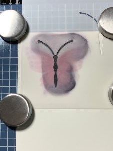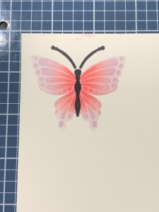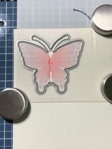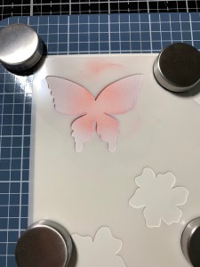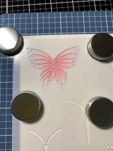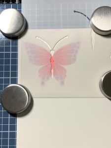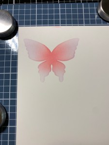 To create some elements for my card I place a piece of White Cardstock onto my Make Art Stay-tion then place the outline stencil (#1) from the Fluttering Fall Layering Stencil Bundle over the panel and hold everything down with the magnets. I then take my Blending Brush and lightly blend Lovely Lavender Ink over the butterfly opening. With the stencil still in place, I lightly blend Light Carnation Ink over the center area of the image, fading it into the previous color. To deepen and brighten the color a bit, I blend Medium Carnation Ink to the very center of the image then remove the stencil. *These stencils all have etching on the front side and labeled 1, 2 and 3. Be sure you are blending with the etching side up so that everything lines up and die cuts properly.