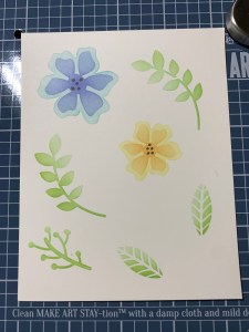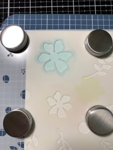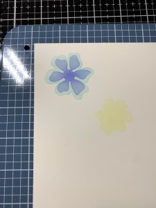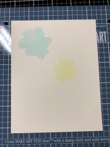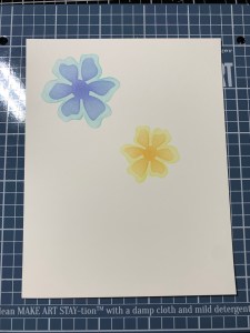 Taking the outline stencil (#1) I blend Ocean Mist Ink over the large flower image and blend Lemon Drop Ink over the small flower image with my Blending Brushes. I then go back with the #3 stencil, line it up and blend Wild Wisteria Ink over the large flower and Sweet Mango Ink over the small flower. For the center detail of both flowers I use the #3 stencil and blend Slate Ink.