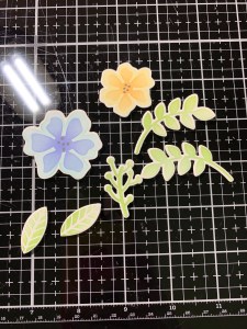 Using the same #3 stencil I blend all of the greenery and leaves with a full coverage of Applemint Ink and then blend a little bit of Jelly Bean Green Ink for some shading to the base and edge of the images. Now that my blending is complete I use the coordinating dies to cut out the images, running them through my Big Shot.