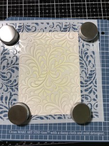 Next, I take the detail stencil (#2) and line it up over my blended image. I then go back with the same colors and again blend using my Mini Blending Brushes, this time with a heavier hand.