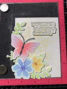 I now start to adhere the elements onto the card front. Using Liquid Glue I adhere the yellow flower down, I then add a Foam Square onto the back of the blue flower and adhere it down. I also add Liquid Glue to all of the greenery pieces and adhere them into place. For the butterfly I cut a Foam Square into three pieces and placed them along the backside of the body then adhered it at an angle between the flowers and sentiment.