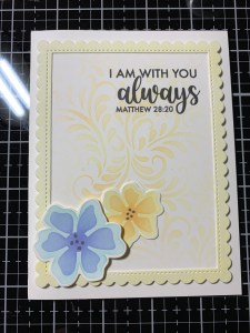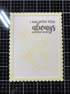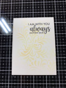 Now it’s time to stamp my sentiment. I place the blended panel into the corner of my MISTI Stamp Positioner and lay out the stenciled elements to figure out my stamp placement. I then choose a sentiment from the Sympathy & Love Stamp Set and position it towards the top right portion of my panel. I then remove the elements and stamp my sentiment using Amalgam Obsidian Black Ink.