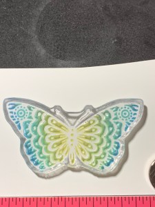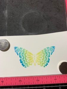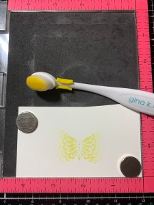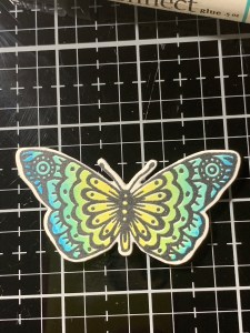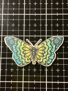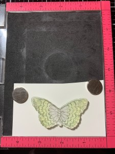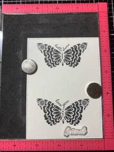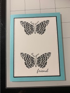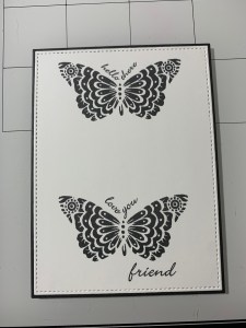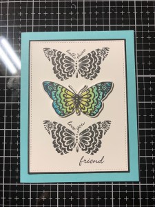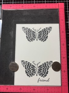 Next, I take two of the antennae sentiment images from the Beautiful Butterflies 3 Stamp Set and position them just above the butterflies then stamp the with Amalgam Obsidian Black Ink. I then take the “friend” image from the same stamp set and stamp it under the bottom image again, with Amalgam Obsidian Black Ink.