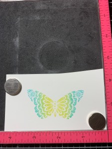 For the center image a place a piece of White Cardstock into the corner of my MISTI and position the same previously used butterfly stamp from the Beautiful Butterflies 3 Stamp Set in the center. Using my ink cubes, I first take Lemon Drop Ink and ink up the center of the stamp. I then use my Mini Blending Brush and tap it at the outside edges of the ink, this will help to soften the edges allowing the ink colors to blend without any harsh lines. I then stamp the image onto the cardstock. I repeat this stamping a couple of times until I have the shade of ink I want. Next, I take my Sea Glass Ink and ink up the stamp, overlapping where the yellow ink is just a little to create a green shade that transitions into the blue. I then take my Mini Blending Brush and tap the area that over laps the yellow to soften the ink blend then stamp it onto the cardstock. To add a darker edge to the image, I use Blue Raspberry Ink and add it just to the outside edge of the stamp, then stamp it onto my panel.