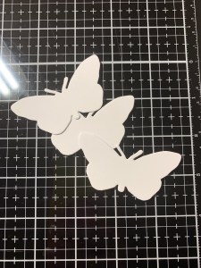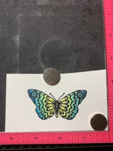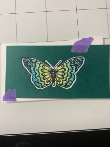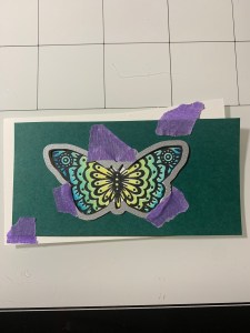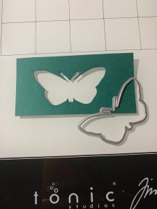 To cut out my image, I take the coordinating die from the Beautiful Butterflies Die Set and cut out of a scrap piece of cardstock, this will serve as a guide to ensure a perfect alignment. I then center the negative piece over my stamped image and tape it into place. Next, I place the die over the image and wiggle it around until I feel in drop into place, then tape it down and run them through my Big Shot. I now have and evenly die cut image.