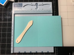 Using the large layering die from the Master Layouts 2 Die Set I cut out of Black Cardstock, running them through my Big Shot. I then add Liquid Glue to the back of my stamped panel and adhere the two panels together. Next, I place a 8 1/2″ x 5 1/2″ piece of Sea Glass Cardstock into my Scor Buddy and score it at 4 1/4″, creating a side folding card base. Using Liquid Glue I center and adhere my panel onto the card base. I now take my stacked die cut and add Liquid Glue to the back of it and mount it onto my card front making sure it is centered between the two stamped images.