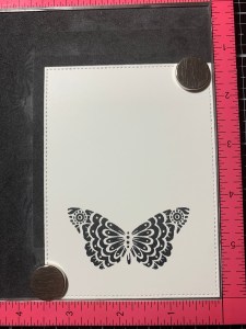 To start, I take the large stitched rectangle die from Master Layouts 2 Die Set and cut out of White Cardstock, running them through my Big Shot. I then place the panel into the lower right corner of my MISTI Stamp Positioner. I will be stamping three butterflies (all of the same image) onto this panel. I choose an image from the Beautiful Butterflies 3 Stamp Set and position it so there will be enough room to stamp two additional times above it while leaving a little extra room at the bottom to be able to stamp a sentiment (I temporarily place my sentiment stamp under the image to be sure I am leaving enough space before stamping). I then ink up the image using Amalgam Obsidian Black Ink and stamp it onto the panel. I clean off the stamp then line it up at the top of the panel so there is enough space in between to even stamp the center image. I again stamp the image using Amalgam Obsidian Black Ink.