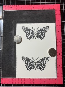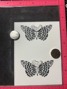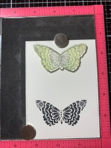 Next, I take the same coordinating image, this time from the Beautiful Butterflies 2 Stamp Set and line it up over my stamped image. I then stamp this image using Amalgam Obsidian Black Ink over my previously stamped image. You can see how beautiful these two stamp sets work together, so cool!! *The images are simple to line up as you can see through the stamp and see the colors fit into the openings, all white areas will be stamped with this image, if that makes sense?
