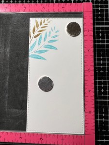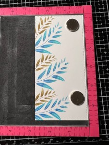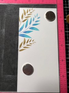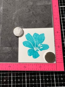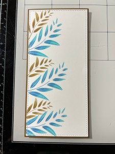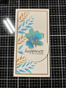 I remove the previous stamp and choose a larger image from the same Happy Life Stamp Set and position it just under the previous image. I then ink the stamp with Turquoise Sea Ink and stamp it onto the panel. Leaving the image attached to the door of my MISTI, I ink up the inner parts of the leaves using Blue Denim Ink then take my Mini Blending Brush and tap it along the outer edges of the inked leaves to create a soft blend then stamp it over the stamped image. *For this technique I like to use my ink cubes as they are easier to get into smaller areas. A mini blending brush could also be used to add ink to an image, it would just take a couple of extra applications for the ink to show up better.