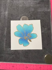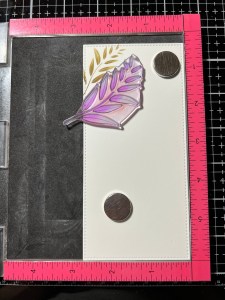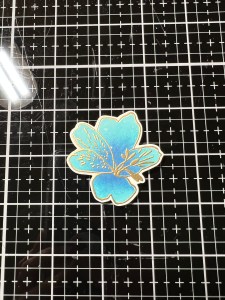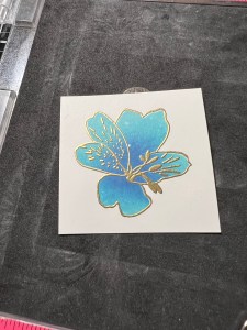To add some texture to my image, I take the detail images from the same Happy Life Stamp Set and line them up over the petals. I then stamp them with Versamark Ink, add Gold Embossing Powder then heat set with my Heat Tool. Taking the coordinating die from the Happy Life Die Set I center it over my stamped image the run them through my Big Shot.