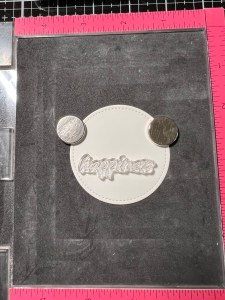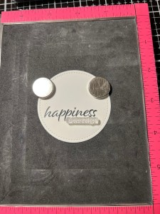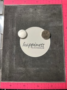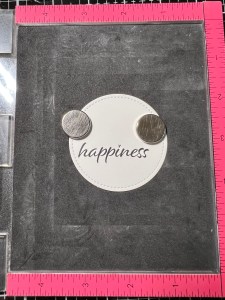 To create my sentiment, I take the smallest die from the Single Stitched Circles Die Set and cut out of White Cardstock, running them through my Big Shot. Next, I place the die cut into my MISTI and line up a greeting from the Happy Life Stamp Set across the lower portion and stamp it Amalgam Obsidian Black Ink. I then line up a sentiment from the same set just under the greeting and stamp it also with Amalgam Obsidian Black Ink.