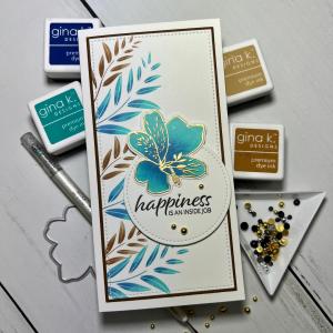 Today, for my second card, I kept it clean and simple using the brand new Happy Life stamp set illustrated by Lisa Hetrick from the new release. I decided to go with a mini slimline card and do some simple stamping. To step my card up a little, I added some ink shading to the stamped images. To help my focal image stand out a little more I added gold embossing for the outline stamped image. Using different colored ink that compliments each other or creates contrast is a great way to step up a simple look. Switching up card sizes is a fun way to add variety to your card making and allows different layout options! All of the stamps, dies, inks, cardstock and embellishments I used on today’s card are from Gina K. Designs. Let’s get started!!