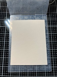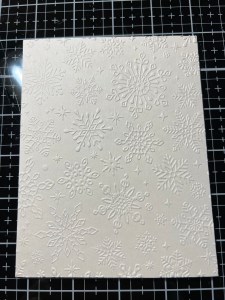 To start, I cut a 4 1/4″ x 5 1/2 piece of Barely There Cardstock using my Guillotine Paper Trimmer and place it into my Snowflakes Embossing Folder and run it through my Platinum 6 Die Cutting Machine. I set it aside and work on my panel.