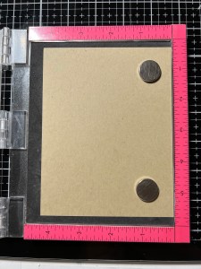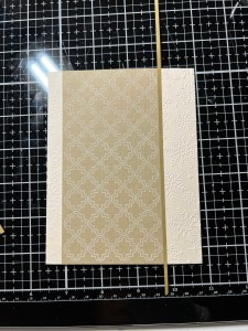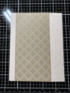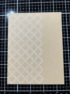 To create a layered panel, I place a 4 1/4″ x 5 1/2″ piece of Kraft Cardstock into my MISTI Stamp Positioner and line up the background image from the Hello Beautiful Stamp Set so it is even along the edge of the cardstock. I then pick up the stamp with the door of my MISTI and ink the stamp with White Pigment Ink and stamp it onto the cardstock. *I end up stamping the image 2 – 3 times to get a good image.