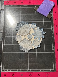 To add a little interest and the look of snow I apply a small amount of Picket Fence Distress Paint onto my Glass Mat then take a dampened paintbrush to pick up the paint and spatter it over the snowflakes then set it aside to dry as I work on my frame.