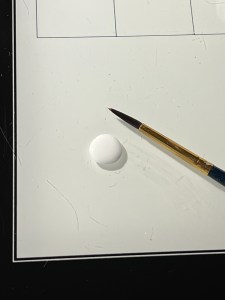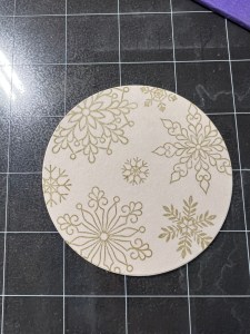 Now that my paint has dried I adhered the stacked frame onto the snowflake circle using Liquid Glue. I then glued the circle onto my panel, shifting it to the right so it hangs off a bit.
