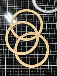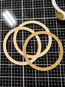 Using the frame die from the Circle Shadow Shakers Die Set I cut out of Kraft Cardstock three times, running them through my Platinum 6. To bring in the same shading as my strips, I blend Kraft Ink onto one of the die cut circles with my Mini Blending Brush. Using Liquid Glue I stack and glue the die cuts together with the blended piece on top.