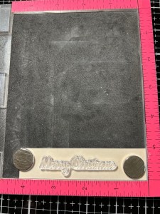 For my sentiment, I place a piece of Barely There Cardstock into my MISTI and chose a greeting from the same Blizzard Stamp Set then stamped it using Amalgam Obsidian Black Ink. After allowing the ink to completely dry, I take the coordinating die from the Blizzard Die Set and cut the greeting out, running them through my Platinum 6.