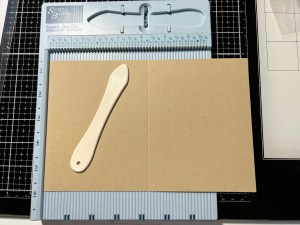 To create a little interest to separate the two panels, I take a strip of Kraft Cardstock and blend Kraft Ink over it with my Mini Blending Brush to make the cardstock a shade darker. I then cut two thin strips using my Guillotine Paper Trimmer then added Liquid Glue to adhere them against each edge of the panel and trimmed off the overhang. *I didn’t want to add too much contrast to the strips so I ink blended with the same color of ink to give it a slightly darker shade. Using tone on tone is a great way to add subtle shading within the same color.