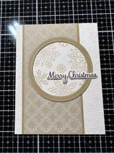 For my focal image I take the outline die from the Circle Shadow Shakers Die Set and cut out of Barely There Cardstock, running them through my Platinum 6. Next, I placed the die cut piece onto my Sticky Mat in my MISTI then arranged some of the snowflakes from the Blizzard Stamp Set over it. I inked them using Kraft Ink then stamped them onto the die cut piece using my Stampin Bug to apply even pressure (I also used it for my background panel). ***Using a sticky mat is a great way to hold cardstock in place for off the edge stamping. The sticky mat that I use (that I have linked) has pretty low tack stickiness. This mat is not overly sticky at all. I have only used it a few times so I’m not sure what the long term stickiness will be. To preserve the stickiness be sure to replace the top acetate piece back over the sticky side of the mat when not in use.