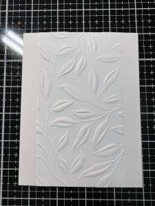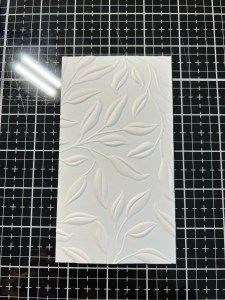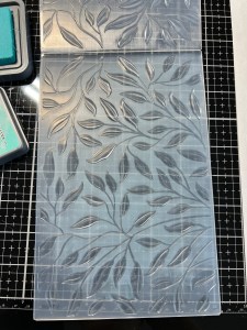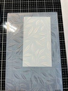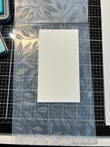 For my background piece, I cut a 3″ x 5 1/2″ panel out of White Cardstock using my Guillotine Paper Trimmer. Next, I took my Brayer and inked it well with Salvaged Patina Distress Oxide Ink then took a piece of copy paper and rolled my Brayer over it removing most of the ink. I then took the Brayer with the remaining ink left on it and rolled it over the “inverted” side (the side where the design is pushed into the plastic leaving just the background exposed) of my Leafy 3D Embossing Folder back and forth to get smooth, even coverage. Taking my panel, I line it up over the un-inked side of the embossing folder where I like the design, then close the inked side over it and run it through my Platinum 6 Die Cut Machine. I now have a dry embossed panel with only a slight tint of color over the background. *The only reason I removed most of the ink from my brayer is because I wanted only a “tint” of color. If you wanted the color to really show up then don’t remove any ink from the brayer before rolling onto the folder.