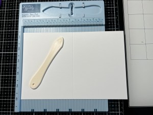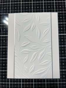 Next, I place a 5 1/2″ x 8 1/2″ piece of White Cardstock into my Scor Buddy and score it at 4 1/4″, creating a side folding card base. Using Liquid Glue, I adhere the embossed panel to the center of my card front. To give the edges of the panel more of a finished look, I use my Guillotine Paper Trimmer to cut two very thin strips of Matte Silver Cardstock. I then take my Fine Tip Bottle filled with Liquid Glue and add small drops to the back of the strips and adhere them against either side of the panel and cut off the overhang. These strips help add separation to the panel from the card front and will match my die cut image of my finished card.
