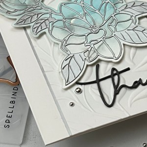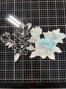 Now that my alcohol inked panel has had a chance to completely dry, I take the outline die from the Magnolia Blooms Die Set and place it over the panel then run them through my P6.