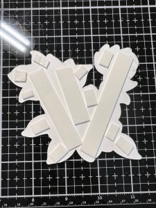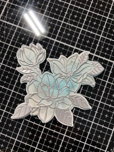 Taking the outline die from the same Magnolia Blooms Die Set I cut out of Matte Silver Cardstock, running them through my P6. Using Liquid Glue I adhere this die cut to the previously cut shadow layer piece. To add some dimension I add Foam Tape to the back then mount it onto my card front just above center.