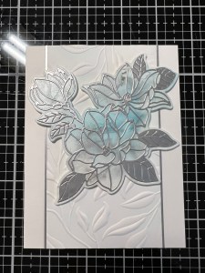 Today, I have clean and simple card that is stepped up a bit by using alcohol inks and an inked embossing folder. I wanted to create a soft feel to go along with my delicate die cut focal image. I knew I wanted to incorporate alcohol inks into my flowers, to bring in a soft flowy look without overpowering the color. While I love a white on white dry embossed look, I wanted to create a color separation from my card base without clashing with the alcohol ink blend. I added a slight tint of aqua color to the embossed panel, creating a shade that wouldn’t take away from the focal image. To keep with the softness of the card I added a simple delicate script greeting, which I think tied everything together beautifully. Let’s get started!!