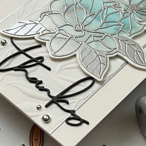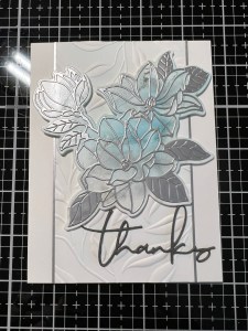 I love how this card turned out, the results of the embossed panel with the added ink was just enough color to make the embossed images stand out a bit more without taking away from the floral die cut. I was very satisfied with the way the alcohol ink and alloy mixed together, creating soft colors that went well behind the matte silver cardstock. This floral die cut would also look great over an ink blended or watercolored background, and can be used for so many different occasions.