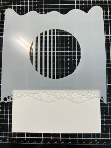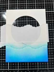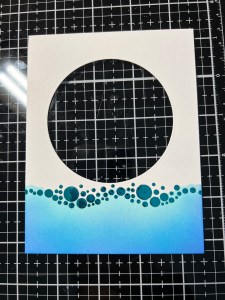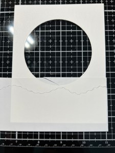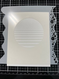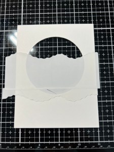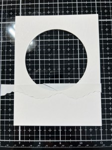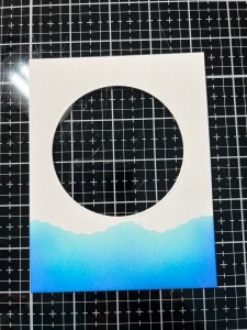 Next, I cut another 4 1/4″ x 5 1/2″ panel out of White Cardstock. I take the plain circle die from the Master Layouts 8 Die Set and eyeball the placement to match my blended panel and run them through my Platinum 6 Die Cut Machine. I temporarily place this panel over my blended panel, matching up the cut out window to the blended circle and trim off any uneven cardstock showing around the edges from the blended panel. My panels now match each other with the blended image evenly showing through the window.