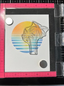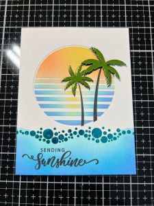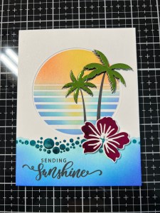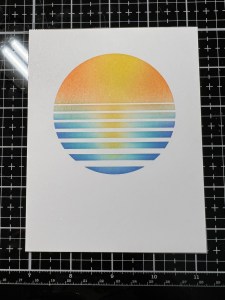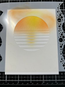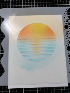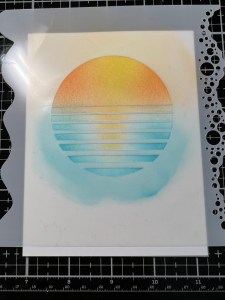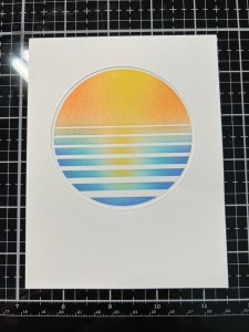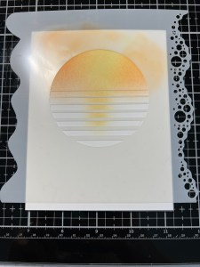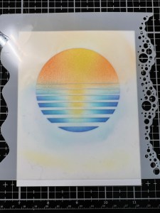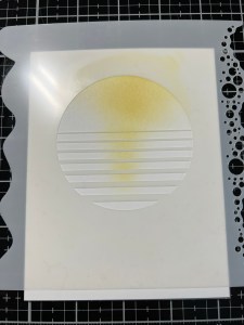 To start, I cut a 4 1/4″ x 5 1/2″ panel out of White Cardstock using my Guillotine Paper Trimmer. I lightly spray the back of my Tropical Blooms Stencil with Pixie Spray. After allowing my stencil to dry for several minutes I place the circle opening onto my panel, slightly above center and gently press down over the thin stripes to adhere down. *Because the area of the stencil that I want to use has some thin lines and I don’t want them to move around when ink blending, I use my Pixie Spray which is a low tack spray that holds things in place. Using my Blending Brush, I blend Sweet Corn Ink to create a circular blend coming out from the top of the stencil circle. Using my Mini Blending Brush, I blend the same Sweet Corn Ink and create a narrow blend down over the lines of the stencil, this will be a reflection from my sun. Next, I blend Sweet Mango Ink around my previous blend and lightly over the narrow blend. To brighten my sun, I take Wild Dandelion Ink and blend it over the sun image and fade it out to the mango ink.