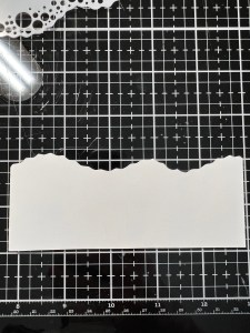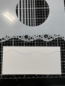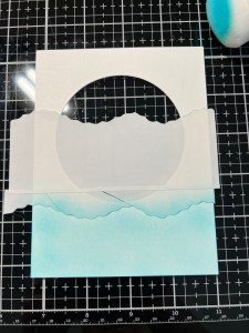 Now it’s time to decorate my top panel. I want to add some ink blended water to the bottom portion of my panel with waves at the top. I cut a 3″ piece of Masking Magic then place the edge of the Tropical Blooms Stencil over it and take a pencil to trace over the waves. I then cut along the pencil marks to create a mask for my ink blending. I take the bottom portion of the mask, remove the release paper and stick it over the bottom portion of my panel where I want the waves to be. I then place the top portion of the mask and fit it back into place. Once I have the top of the mask matched up, I remove the bottom mask to expose my panel where I want the ink blending to be. To protect the rest of my panel from any ink, I place the bottom mask above the waves.