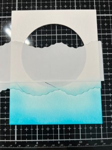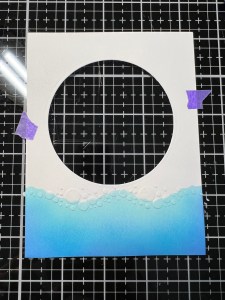 Using my Blending Brush, I blend Turquoise Sea Ink over the entire masked off portion of my panel. Next, I blend Blue Lagoon Ink around the sides and bottom and fade into my previous color. To finish off, I blend Wild Wisteria Ink around the sides and bottom, fading into the previous color. Now that my ink blending is finished, I remove the masks.