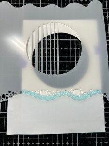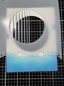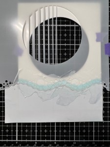 Taking the same edge of the Tropical Blooms Stencil, I line it up where I want to add some foiled bubbles to the top of the waves, just below the inked edge. I then line up and place the mask that I previously cut and adhere it against the edge of the stencil. I tape the stencil down then add Transfer Gel Duo over all of the bubbles using a palette knife. Once I have even coverage, I carefully remove the stencil and mask and set the panel aside to dry while I work on the rest of my card.