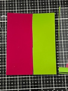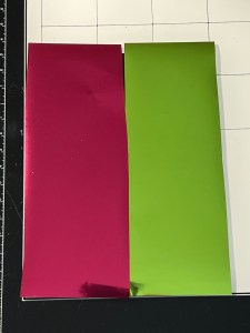 Now it’s time to work on the foiled elements. I cut a strip of Grass Green Foil and Passionate Pink Foil and lay them side by side onto a Toner Panel, place them into a Carrier Sheet then run them through my heated laminator. *Because I have a very cheap laminator, I like to run the panel through twice just to be sure. I wave the panel through the air for a few seconds to cool it down then remove the foil sheet and I am left with a panel of two foil colors to cut my elements from.