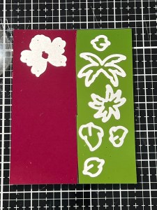Taking some of the dies from the Tropical Blooms Kit, I place them onto the foiled panel and run them through my P6. *I did cut out two of the different flower petals as I wasn’t sure which one I wanted to use, however, I only use one for my card.