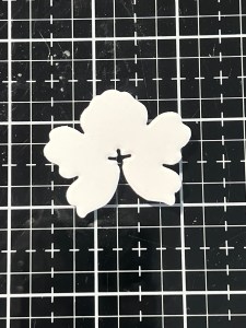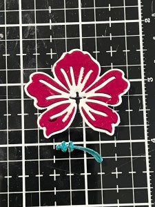 Taking the solid flower die, I cut out of White Cardstock then took the same palm dies to cut out of Black Cardstock. Using Liquid Glue I adhered the petals to the flower die cut and the palms to the black cardstock pieces then set them aside. *I also foiled the small stamen piece using Turquoise Sea Foil.