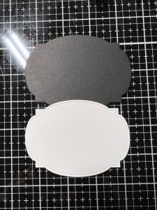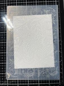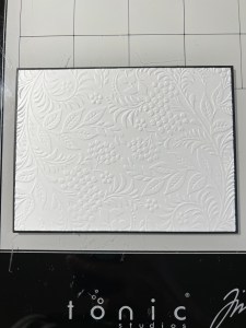 Using the second largest rectangle die from the Master Layouts 1 Die Set, I cut out of White Cardstock, running them through my P6. Next, I place the panel into my Tapestry Embossing Folder and run them through my P6. Using the layering die (the largest die) from the same Master Layouts 1 Die Set, I cut out of Black Onyx Cardstock, running them through my P6. I then add Liquid Glue to the back of my white panel and adhere it to my black panel.