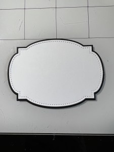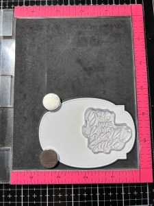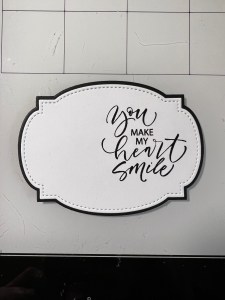 To create a base for my stamped images, I take the two label dies from the Master Layouts 10 Die Set and use the stitched die to cut out of White Cardstock and the layering die to cut out of Black Onyx Cardstock, running them through my P6. Using Liquid Glue I adhere the two die cuts together. Next, I place the label piece into the lower corner of my MISTI and secure it into place using the magnets. I choose a sentiment from the Watercolor Flowers Stamp Set and place it towards the right side of my label then stamp it using Black Onyx Ink.