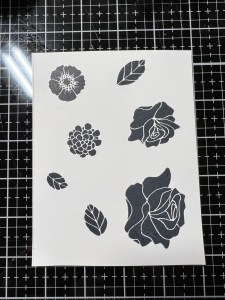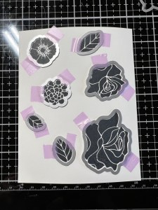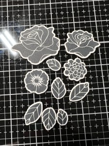 To start, I place a White Cardstock panel into my MISTI Stamp Positioner and place a variety of images from the Bold Flowers Stamp Set onto my panel. I pick up the stamps with the door of my MISTI and ink them using Black Onyx Ink. I then take the coordinating dies from the Bold Flowers Die Set and cut them out, running them through my Platinum 6 Die Cut Machine. I also take two of the dies from the Foliage Fillers Die Set and cut out of White Cardstock, running them through my P6. I set them aside while I work on my card.