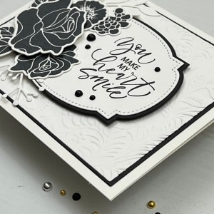 Happy Release Day!!! Gina K. Designs has a brand new release that goes live tonight at 7:00 PM CST. You can find all of the new release items HERE. Don’t forget to check out all of the new products, including a brand new bundle! Gina will be going live on her Facebook and YouTube channel where she will showcase each product up close and will wrap things up with creating a card project. Today, I have a card made with the brand new Bold Flowers stamp set. I kept my card simple using black and white elements to give a clean and classic look. This stamp set is great for all different kinds of techniques with the bold, solid images. All of the stamps, dies, cardstock, ink and embellishments I use are from Gina K. Designs. Let’s get started!!