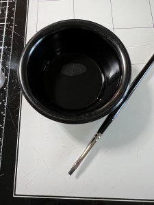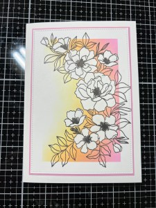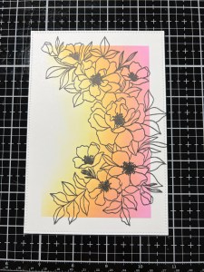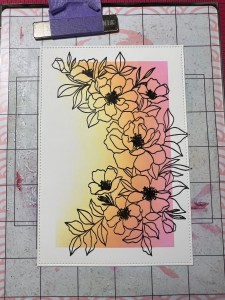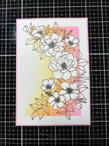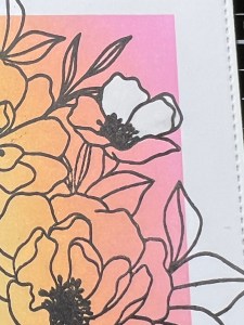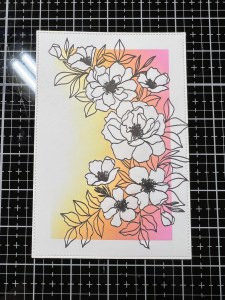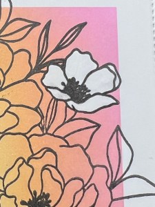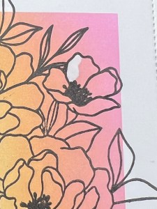 Now it’s time for the fun part! After allowing the black ink to dry completely, I add a small amount of bleach to a dish and use a very small paintbrush to add some bleach to my first petal. I continue adding small amounts of bleach to my brush and paint in all of the petals of each flower until all flowers are white. I leave all of the leaves in the image unbleached, allowing the ink blend to show through. *I don’t think all of the black ink was completely dry when I added the bleach, as some of the centers bled just a bit when coming into contact with the bleach. In hindsight, I should have dabbed the bleach around the centers of the flowers instead of using brushstrokes, this may have prevented the ink bleed. Instead of starting over, I continued on and learned from my mistake for next time.