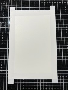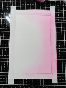 To start, I take the large stitched rectangle die from the Master Layouts 8 Die Set and cut out of White Cardstock, running them through my Platinum 6 Die Cut Machine. To create a border on my panel where I don’t want any ink, I use Masking Magic Strips and take the 1/2″ width strips and adhere them up to the very edges all four sides.