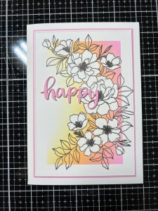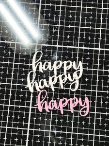 For my greeting, I take the word die from the Happy And Shadow Die Set and cut out of Bubblegum Pink Cardstock once and two times out of White Cardstock, running them through my P6. Using Liquid Glue I stack the die cuts together with the pink on top then glue them onto the card front.