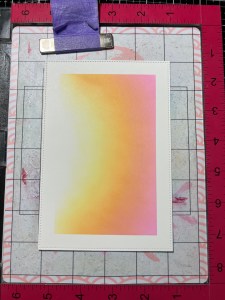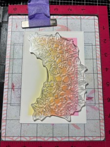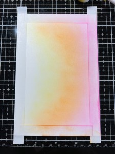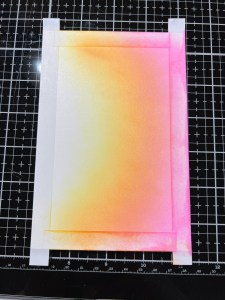 Now it’s time to add some ink. Using my Blending Brushes, I start by blending Bubblegum Pink Ink onto the left side of the panel, fading the blend around the top and bottom. Next, I blend Sweet Mango Ink further to the left and blend it back into the previous color a bit. I then blend Lemon Drop Ink, fading towards the left side of the panel and back into the previous color. To finish, I go back through each of the colors and blend them into each other to create a seamless blend. *The ink may look a little splotchy right now, but will dry to a soft blend. Now that my ink blending is finished, I carefully remove the masking strips and I now have a framed ink blend with the ink fading into white on the left side.