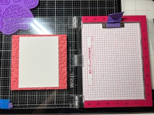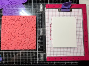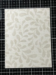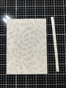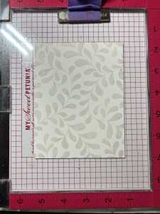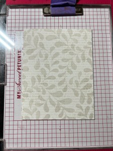 Now it’s time to stamp the script stamp. I repeat the above process and adhere the You Are Background Stamp to the door of my MISTI then line up my panel face down onto the stamp, making sure it is straight over the script. I close the base of my MISTI onto the door and flip it over. My panel is now ready to be stamped and is lined up perfectly. I ink up the stamp using Jellyfish Ink and stamp it onto my panel. These two inks are similar in color but are just different enough in tone that they show up well against each other. Now that my stamping is complete, I trim 1/4″ off the side making the panel 4″ x 5 1/2″. *This dimension will change further into the process when I change my mind. In hindsight, I would have just started out with the correct size before stamping but I wasn’t sure what I wanted to do with the stamped panel until I was further into the card.