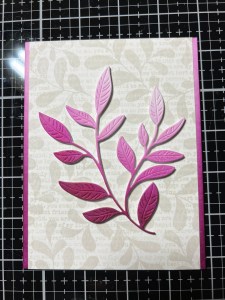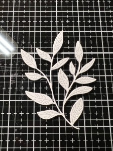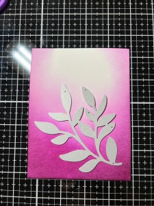 After allowing my inked blended panel to dry for several minutes, I take the Privet Branch Die and place it over an area that will show the gradient blend then run them through my Platinum 6 Die Cut Machine. I then cut out of White Cardstock four times, running them through my P6. Using Liquid Glue in my Fine Tip Bottle I stack and glue the white die cuts together then glue the ink blended piece on top.